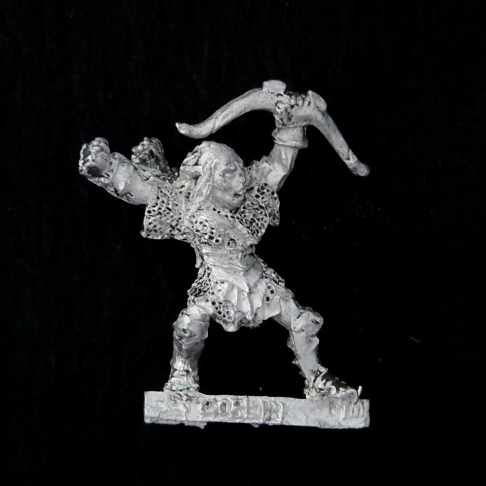 Moria Goblin Captain snarls orders from the shadows, blade raised high. Cunning and cruel, he drives his kin forward with ruthless fury.